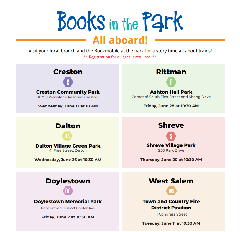 Visit our Bookmobile for a story time in the parks during Books in the Park this summer.