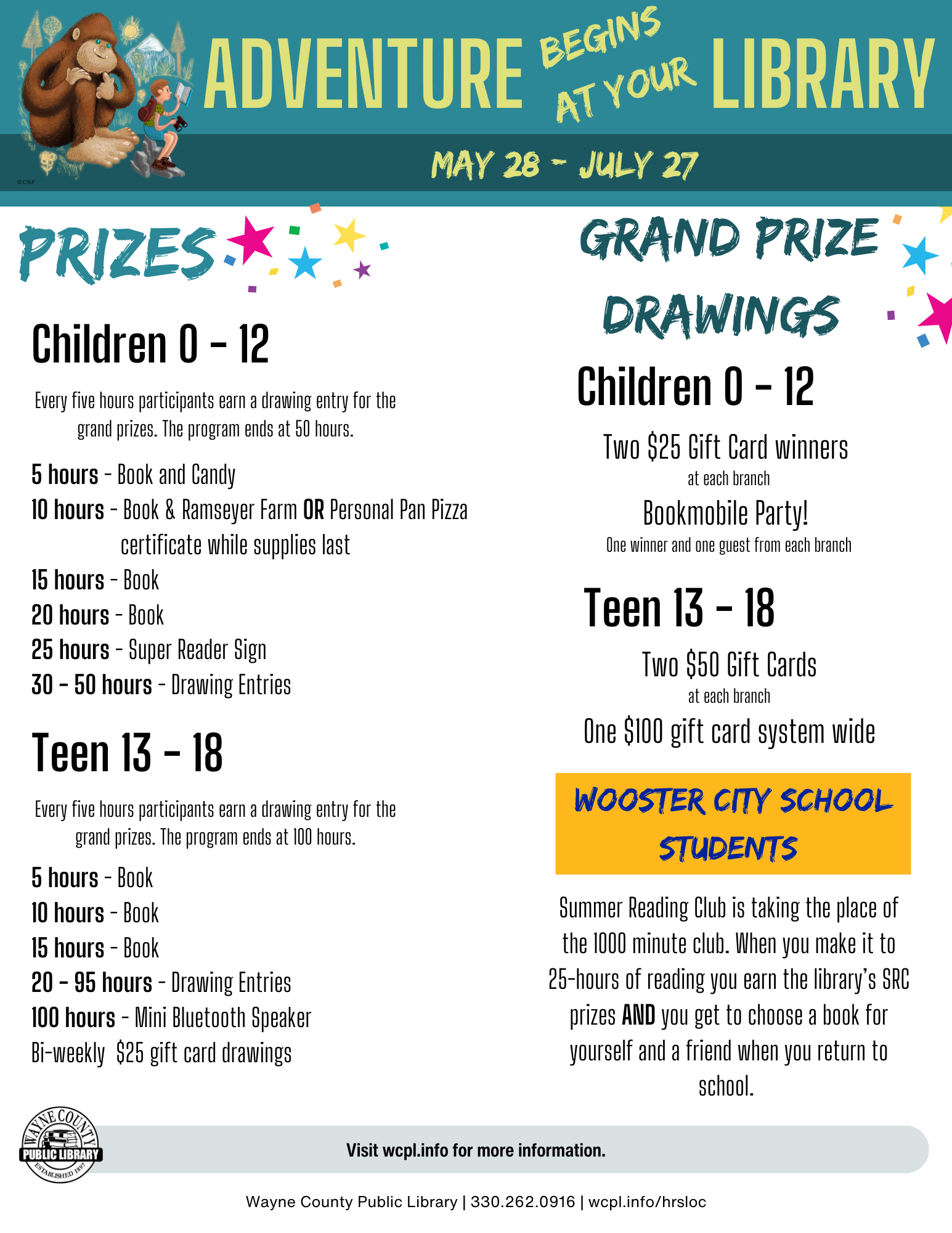 New this year for Wooster City School Students, Summer Reading Club is taking the place of the 1000 Minute Club. When you make it to 25-hours of reading you earn the library’s SRC prizes AND you get to choose a book for yourself and a friend when you return to school.